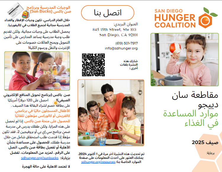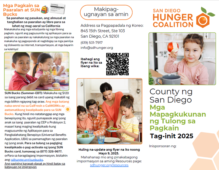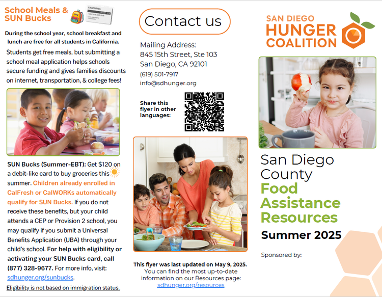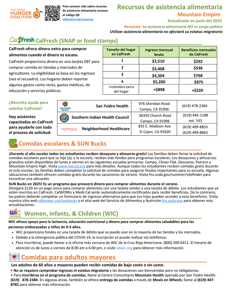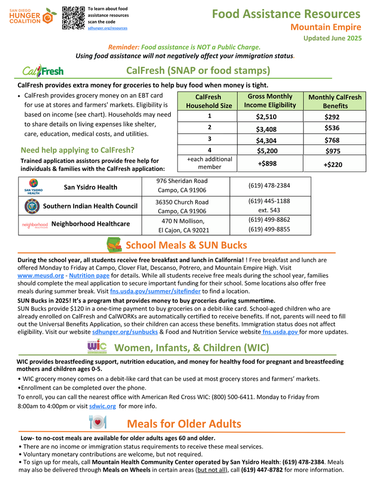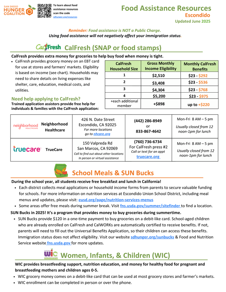 Food Assistance Resources in San Diego CountyOn this page you will find food assistance resource flyers that provide helpful information to help you get started. Download and share with anyone you know who needs food assistance! County Wide flyers (13 languages)Escondido (English & Español)Mt. Empire (English & Español) San Diego County English Español (Spanish) Cambodian/Khmer 中文 (Chinese) فارسی (Farsi) Kreyòl (Haitian Creole) русский (Russian) Soomaali (Somali) Kiswahili (Swahili) Tagalog Tiếng Việt (Vietnamese) 한국어 (Korean) عربى (Arabic) Escondido Food Assistance Resource Flyer English Español (Spanish) Mountain Empire Food Assistance Resource Flyer English Español (Spanish)