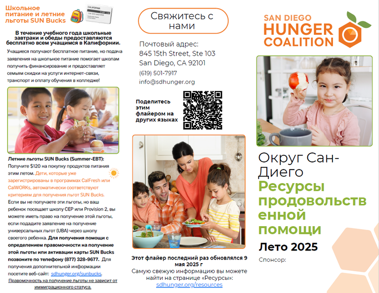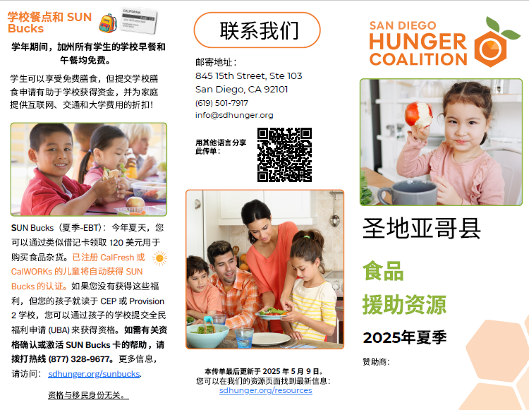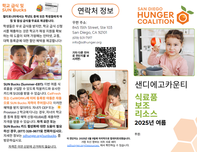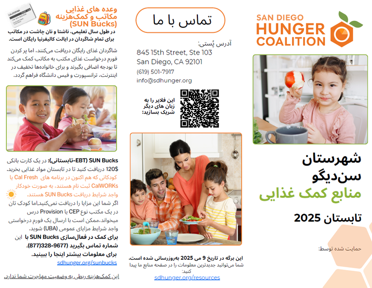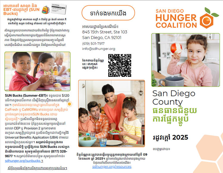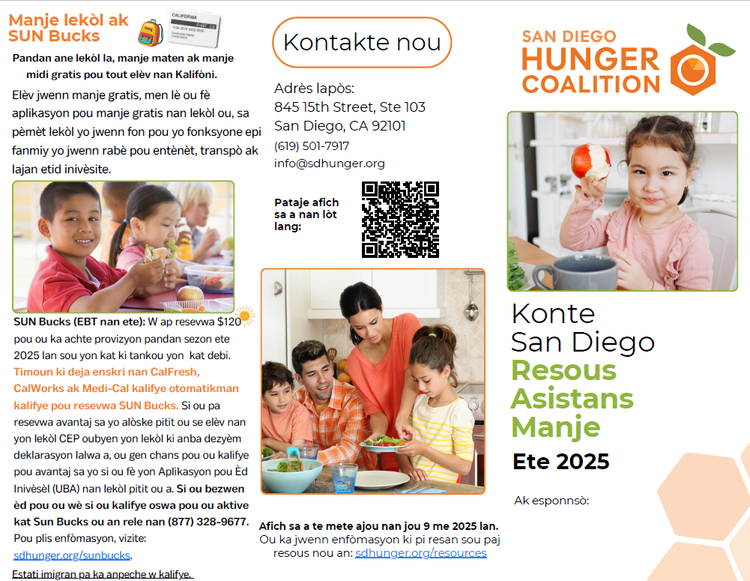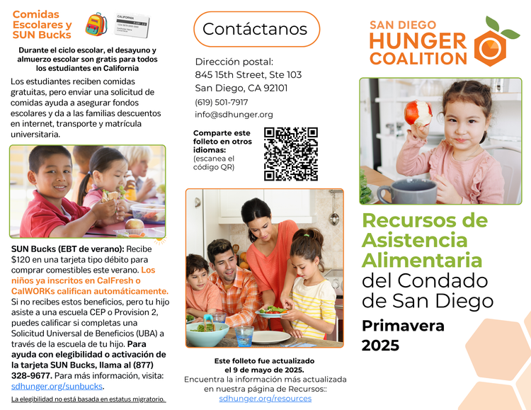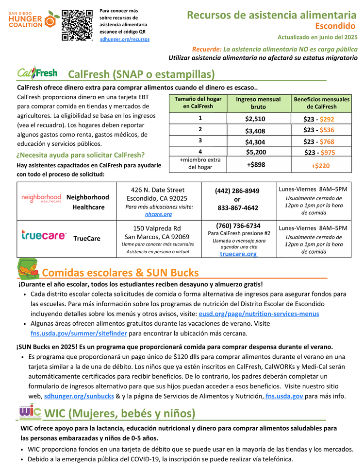 Food Assistance Resources in San Diego CountyOn this page you will find food assistance resource flyers that provide helpful information to help you get started. Download and share with anyone you know who needs food assistance! County Wide flyers (13 languages)Escondido (English & Español)Mt. Empire (English & Español) San Diego County English Español (Spanish) Cambodian/Khmer 中文 (Chinese) فارسی (Farsi) Kreyòl (Haitian Creole) русский (Russian) Soomaali (Somali) Kiswahili (Swahili) Tagalog Tiếng Việt (Vietnamese) 한국어 (Korean) عربى (Arabic) Escondido Food Assistance Resource Flyer English Español (Spanish) Mountain Empire Food Assistance Resource Flyer English Español (Spanish)