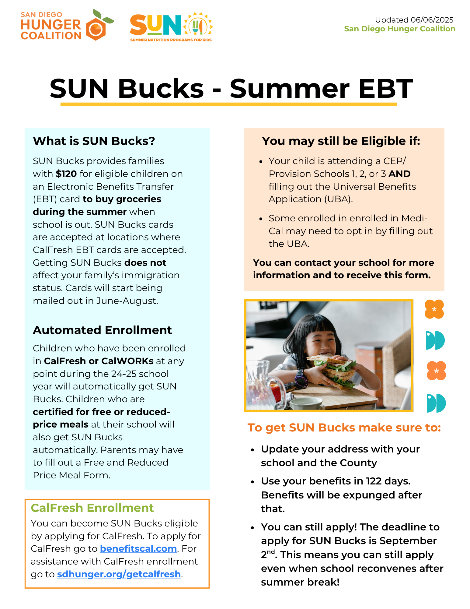 SUN Bucks, also known as Summer EBT (S-EBT), is a new program to help families buy food for their school-aged children during the summer. Families will get $120 for each eligible child to buy groceries during the summer. Families must use SUN Bucks within 122 days of funds being loaded to their card. Children who get SUN Bucks can still participate in other summer meal programs. SUN Bucks will not affect immigration status.