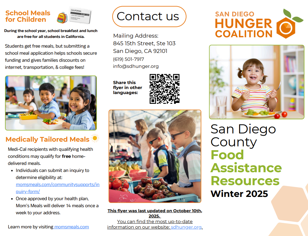 The San Diego Hunger Coalition conducts training and provides technical assistance for community-based organizations and schools; educates policymakers and the public about social, economic, and environmental factors that contribute to hunger; and advocates for legislative and administrative policies to end hunger, promote nutrition and protect public health.