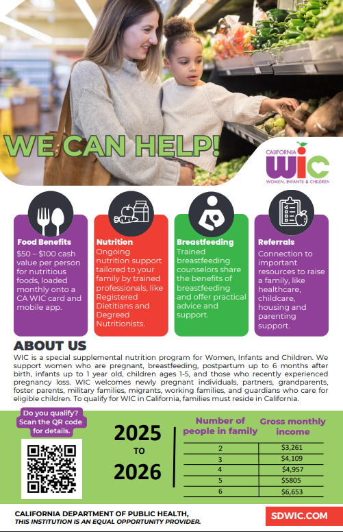 WIC provides breastfeeding support, nutrition education, and money for healthy food for pregnant and recently pregnant women, and children ages 0-5.