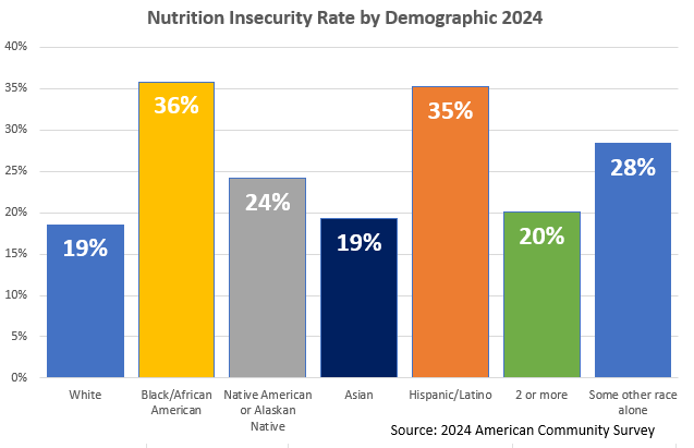 Nutrition insecurity also disproportionately impacts Black people, Indigenous people, and people of color. The nutrition insecurity rates of these communities are all above the average, as can be seen below.
