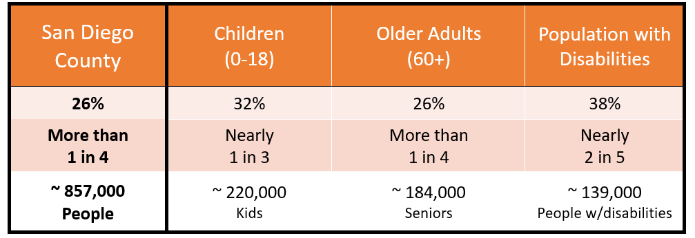 Out of the 857,000 total people estimated to be nutrition insecure in San Diego County, 220,000 of them are children, 184,000 are older adults (age 60+), and 139,000 of them are living with disabilities.