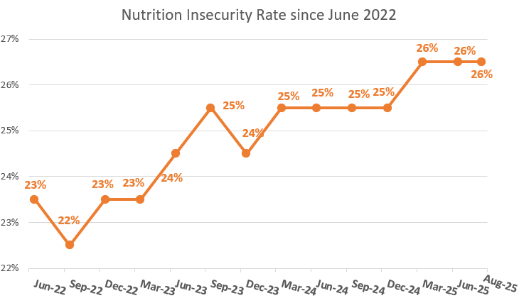 San Diego Hunger Coalition estimates that, as of August 2025, more than 1 in 4 (26%) San Diegans experience nutrition insecurity, or are unable to provide three, nutritious meals per day for themselves and/or their families. This marks eight months of continual increases in nutrition insecurity, which rose to pandemic levels in January 2025 and continues to rise through August.