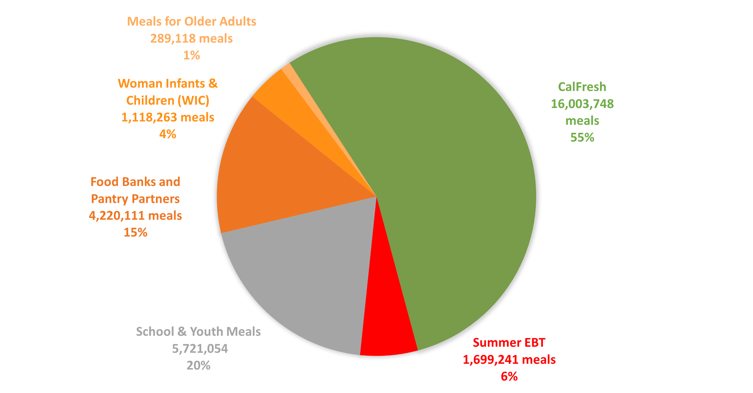 Of the 29.1M meals that were provided, 16M (55%) meals came from CalFresh, followed food banks and pantries, school meals, Sun Bucks, WIC, and meals for older adults. The pie chart below shows the breakdown in more detail.