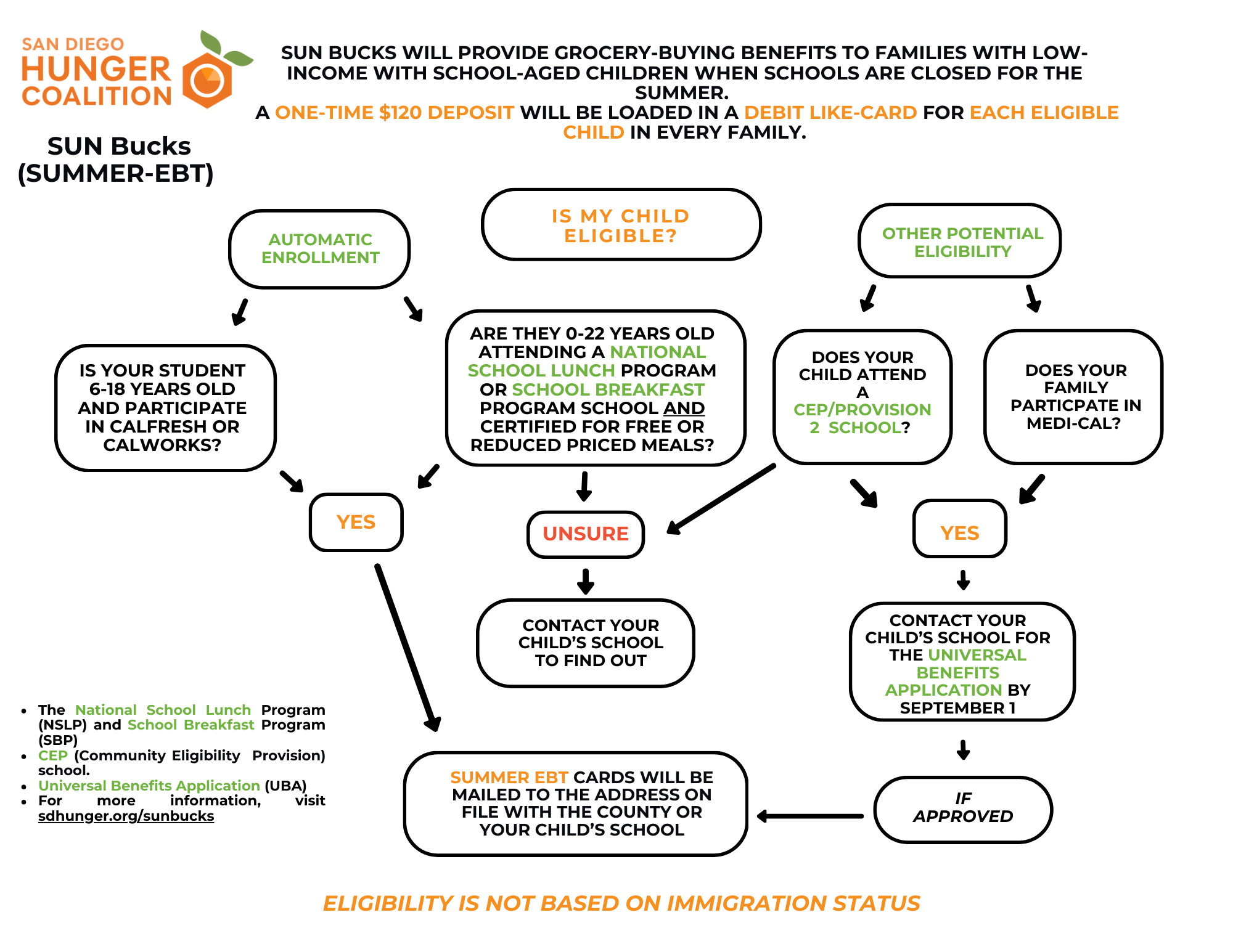 You may still be eligible for SUN Bucks if you do not meet the eligibility requirements listed above. We recommend viewing our Eligibility Flowchart here. You can also gauge your eligibility by answering the questions on the Summer EBT page.